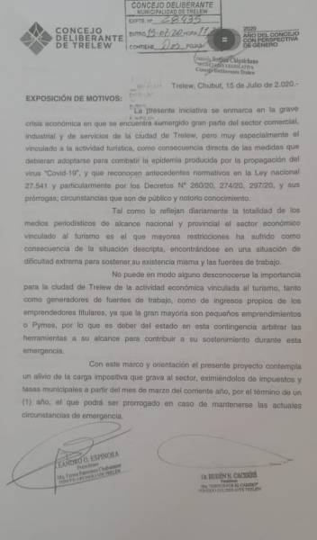 El proyecto establece “eximir del pago de los impuestos al Parque Automotor, Inmobiliario y Tasas de Servicios a los contribuyentes de Trelew habilitados o con trámite de habilitación en curso, bajo las categorías Hotelería, Bares, Restaurantes, Complejos de Entretenimientos, Teatros, Discotecas, Agencias de Viajes, Transporte Turístico, Guías de Turismo, y otros que el Departamento Ejecutivo considere incluidos en la situación de emergencia económica como consecuencia de la pandemia COVD-19”.