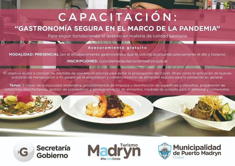 La Municipalidad de Puerto Madryn, a través de la Secretaría de Gobierno y la Secretaría de Turismo, convoca al sector gastronómico a recibir una capacitación gratuita por parte del personal técnico municipal sobre “Gastronomía segura en el marco de la pandemia”. La misma será en modo presencial, en el lugar, y los interesados deberán inscribirse previamente solicitando un turno a cursodemanipulacion@madryn.gob.ar