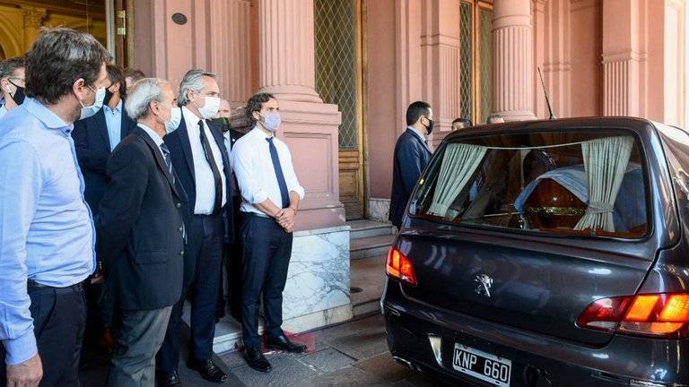 En la puerta de la Casa Rosada, el presidente Alberto Fernández y su jefe de Gabinete, Santiago Cafiero acompañaron el féretro hasta el coche y le dieron su último adiós.