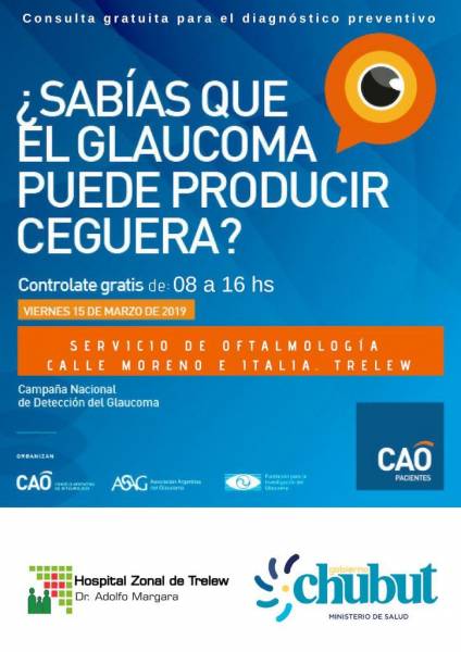 El Hospital Zonal “Dr. Adolfo Margara” de Trelew, dependiente del Ministerio de Salud del Chubut, que conduce Adrián Pizzi, invita a toda la comunidad a participar de los controles oftalmológicos gratuitos, que llevará adelante el próximo viernes 15 de marzo en el marco de la Campaña Nacional de “Prevención de la Ceguera por Glaucoma”.